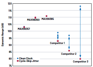 測試結果表明,使用跳周期時鐘時,MAX98357、MAX98360和MAX98365的動態范圍不會降低。此時,器件的動態范圍性能比120dB的DAC還高出20dB。Σ-Δ型DAC抖動容差的更多詳細數據可參見參考文章1。