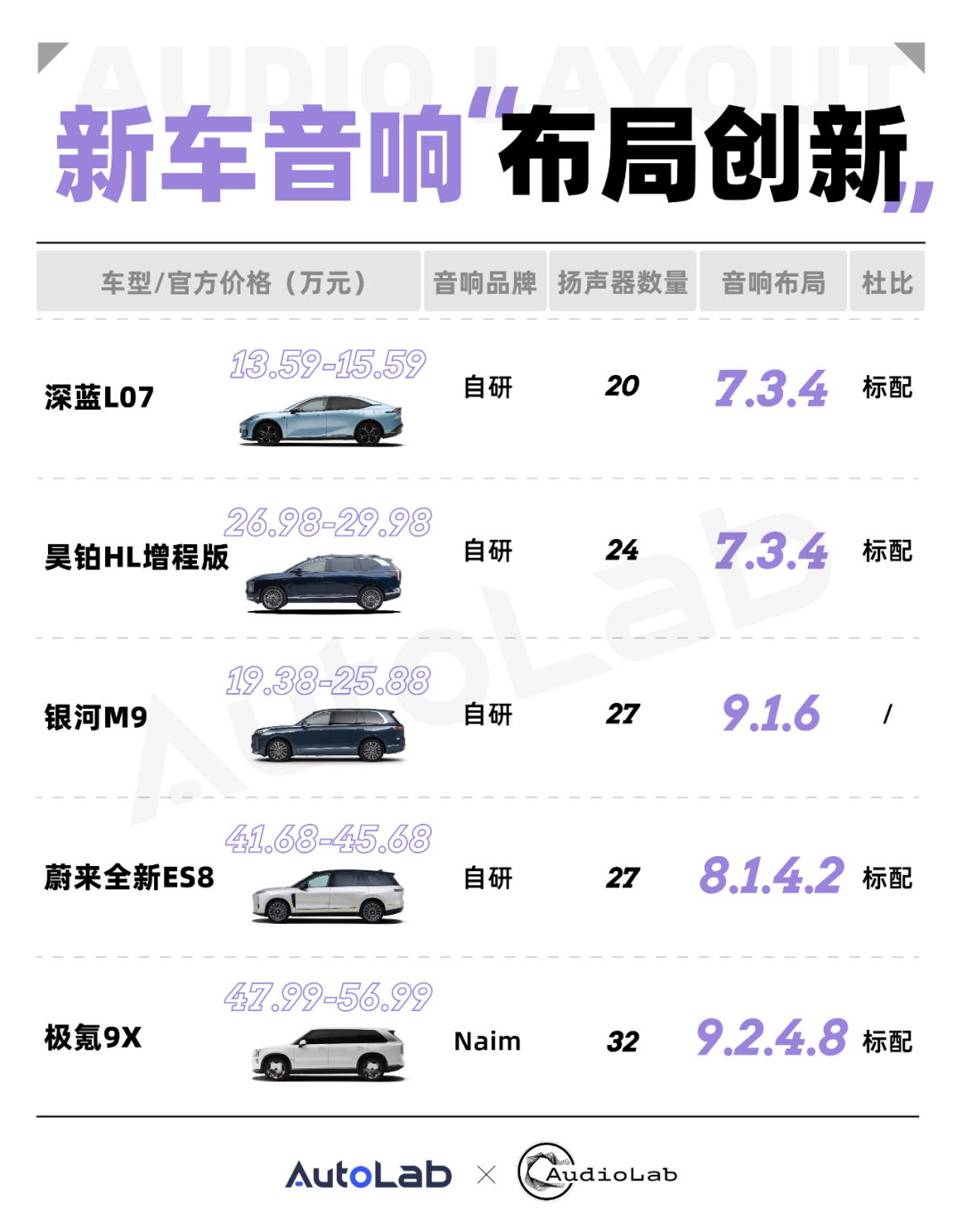 從最近的發(fā)布會(huì)來看,當(dāng)下全尺寸SUV市場(chǎng)車型扎堆,從設(shè)計(jì)到配置的同質(zhì)化越來越嚴(yán)重。為了撕開差異化口子,車企們?cè)谝繇懮系母偁幰膊辉倬窒抻凇氨绕放啤⒍褦?shù)量”,轉(zhuǎn)而在揚(yáng)聲器布局上也大做文章。當(dāng)7.1.4聲道逐漸成為高端車型的“標(biāo)配”后,更復(fù)雜的布局開始層出不窮,近期也有不少新車便借著 “布局創(chuàng)新” 造勢(shì)。我們也來深扒一下,這到底是“真創(chuàng)新”還是“搞噱頭”。