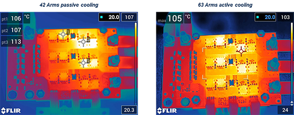 在常規組裝狀態下,MOSFET器件不可見。為檢測其實際溫度,我們采用定制線纜將功率板與控制板重新布置為共面并列結構。通過熱像儀拍攝功率板溫度分布:初始測試關閉風扇,電機以42A(有效值)正弦電流運行,在25℃環境溫度下約15分鐘達到熱平衡狀態。板面最高溫度點出現在低側MOSFET,達到113℃(圖4左)。隨后開啟風扇并將輸出電流提升至63A(有效值),相同最熱MOSFET的最高溫度降至105℃(圖4右),這得益于強制氣流使板卡至環境的熱阻顯著降低。需說明的是,當兩塊電路板堆疊安裝時,預計最高溫度將高于本次測試值,但STL160N10F8器件允許的結溫高達175℃,仍能確保驅動器在全功率運行時的設計裕量與安全可靠性。