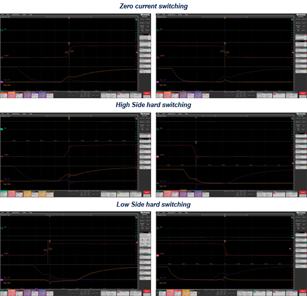 測試平臺對逆變器從空載至最大電流的開關性能進行了評估。圖5所示六組波形分別對應三個半橋中一個橋臂的開關信號(其余橋臂行為類似),包括:1) IU:U相半橋輸出電流;2) outU:U相半橋輸出節點電壓;3) Vgs_lsU:U相半橋并聯低側MOSFET的柵源電壓;4) Vgs_hsU:U相半橋并聯高側MOSFET的柵源電壓。所有電壓信號均采用示波器探頭的短接地彈簧測量,以降低地環路天線寄生耦合引入的噪聲及引線寄生電感[6]。