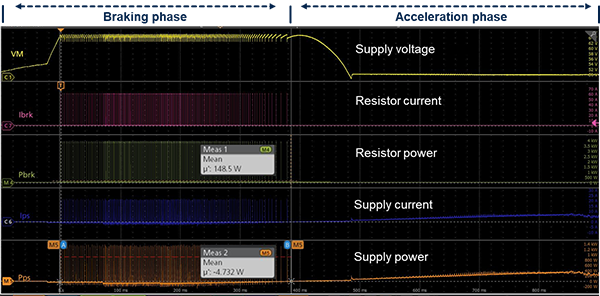 制動電阻的干預實例如圖6所示,本次測試中通過禁用機械制動器(僅保留摩擦損耗)并利用系統旋轉慣量儲存動能,使電機先沿順時針方向運行后突然接收逆時針轉向指令以激發再生制動。如圖6可見,初始階段因電機作發電機運行并向系統bulk電容注入電流,導致總線電壓持續上升;由于測試采用無法回饋能量的單象限電源且未連接其他能耗設備,當電壓超過預設閾值時,保護電路立即啟動,通過制動電阻以脈沖模式多次激活的方式將總線電壓精確鉗位在62-65V安全區間。測試數據顯示脈沖電流峰值達60A,產生約3.4kW的瞬時功率和148W的平均功耗,而EVLSERVO1在此期間僅需從電源獲取4.7W平均功率用于維持內部電容充電。完成制動后,電機成功逆轉方向并進入加速狀態,電源輸出功率逐步提升至400W以驅動系統達到目標轉速。