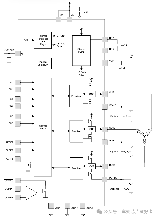 DRV8313 提供三個(gè)可獨(dú)立控制的半H橋驅(qū)動(dòng)器。雖然也可被用于驅(qū)動(dòng)螺線管或其它負(fù)載,它主要用于驅(qū)動(dòng)一個(gè)三相無(wú)刷直流電機(jī)。