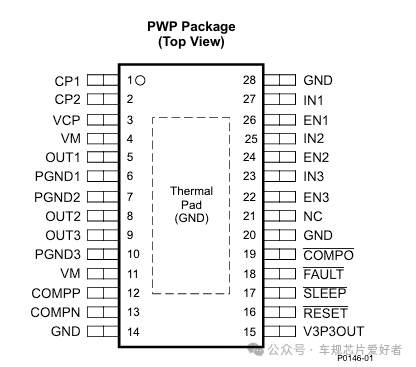 DRV8313 采用 28 引腳散熱薄型小外形尺寸 (HTSSOP) PowerPAD封裝™ 封裝。
