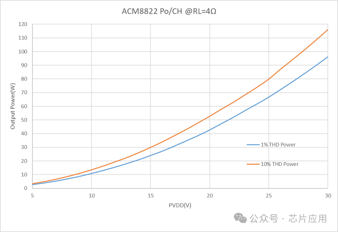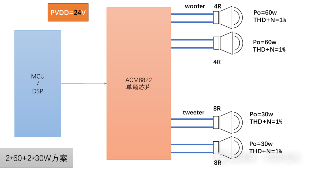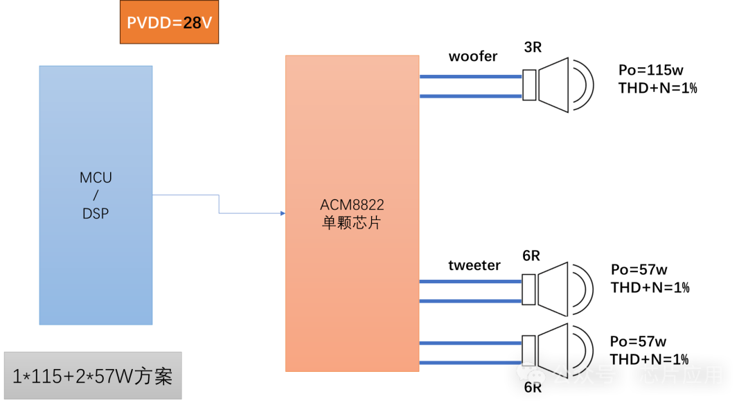 ACM8822應(yīng)用靈活,可以配置為2.1聲道,8822的特點是工作電壓寬,PVDD可以在4.5-30V電壓范圍。為了更好的動態(tài),可以將工作電壓設(shè)為28V,做1*115W+2*57W的組合應(yīng)用。