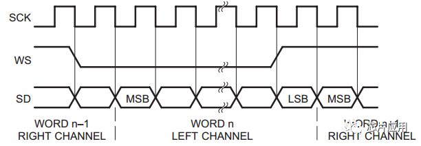 WS也稱幀時鐘,即LRCLK/Left RightClockWS頻率等于聲音的采樣率。WS既可以在SCK的上升沿,也可以在SCK的下降沿變化。從設備在SCK的上升沿采樣WS信號。數據信號MSBWS改變后的第二個時鐘(SCK)上升沿有效(即延遲一個SCK),這樣可以讓從設備有足夠的時間以存儲當前接收的數據,并準備好接收下一組數據。
