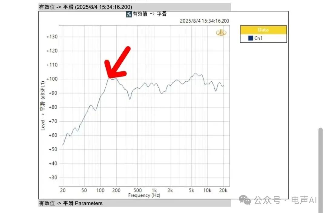 那就是頻響曲線是低頻段明顯的峰值點,這個點基本就是F0。以下這個揚(yáng)聲器的F0是150Hz.與實際測試一致呢。