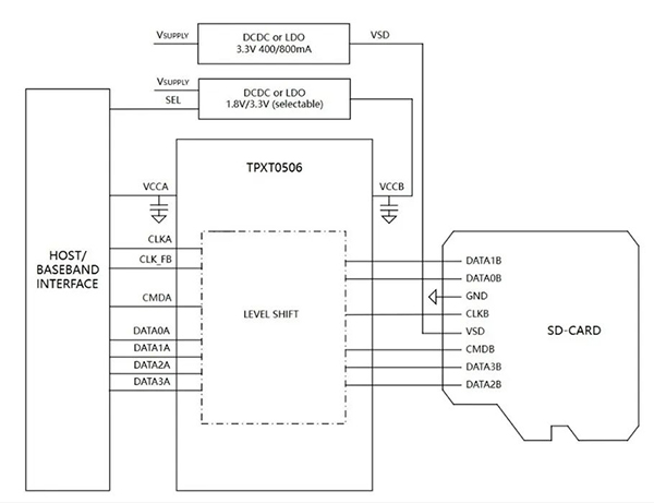 針對SD3.0規范下的高速傳輸需求,TPXT0506提供了低至數納秒的傳播延遲,并專門設計了時鐘反饋通道,以補償電平轉換和PCB走線引入的延遲,為SDR104等超高速模式下的數據讀取提供了充足的時序裕量,確保數據傳輸的穩定與準確。