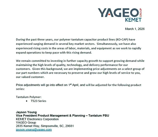 被動元件大廠國巨旗下基美(Kemet)近日再度向客戶發出漲價通知函,宣布對聚合鉭電容器產品線(KO-CAP) T523系列調漲價格。價格調整將于4月1日生效。