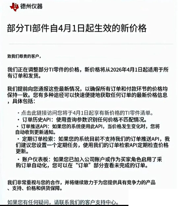 TI漲價通知核心:2026年4月1日起新價格適用于所有訂單及發(fā)貨,可通過以下途徑獲取最新價格: