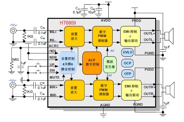 HT6809(帶電子音量/數字音量控制3W雙聲道D類功放IC) |