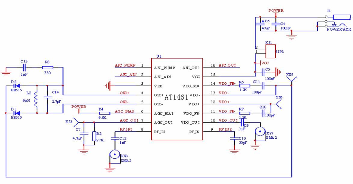 AT1461 是一款寬帶PLL 的 FM 解調芯片,主要應用于模擬衛星電視信號解調。2.4Ghz 衛星信號經過下變頻電路到479.5MHZ 中頻,AT1461 實現中頻段的解調,得到基帶信號(如PAL 制式)供后級電路。采用SOP-16封裝。