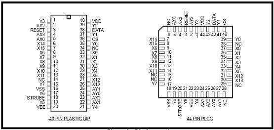 AT8816采用最先進(jìn)的小工藝ISOCMOS制造工藝,功耗低,可靠性高,隔離度好。該電路包含8×16個(gè)模擬開(kāi)關(guān)陣列,7128個(gè)地址譯碼和鎖存電路。通過(guò)不同的地址信號(hào),可以對(duì)128個(gè)開(kāi)關(guān)尋址。DATA端口輸入邏輯電平“1或“0,可對(duì)模擬開(kāi)關(guān)打開(kāi)或關(guān)閉。模擬信號(hào)范圍從VDDVEE。還可以通過(guò)芯片CS,允許對(duì)芯片開(kāi)關(guān)陣列擴(kuò)展。采用PLCC-44/DIP-40封裝。