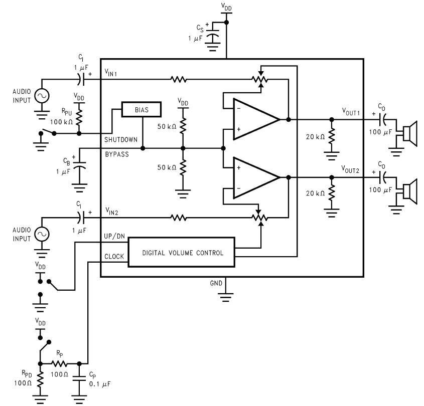 CP4811帶有數字音量調節功能,能通過兩個輸入端調節增益在+12dB 和-33dB之間變化,共有16種增益變化。AT4811帶有低功耗模式,關斷信號高有效;芯片內部也有一溫控電路,實現熱保護功能。