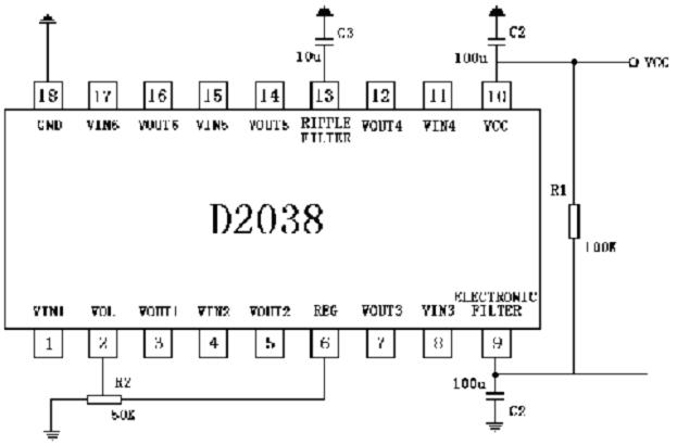 D2038是一塊高集成度、外圍元件少的六通道電子音量控制電路,主要用于有六個功放通道前進行音量控制,且只需調節一個電位器即可同時改變六個功放通道的音量。
