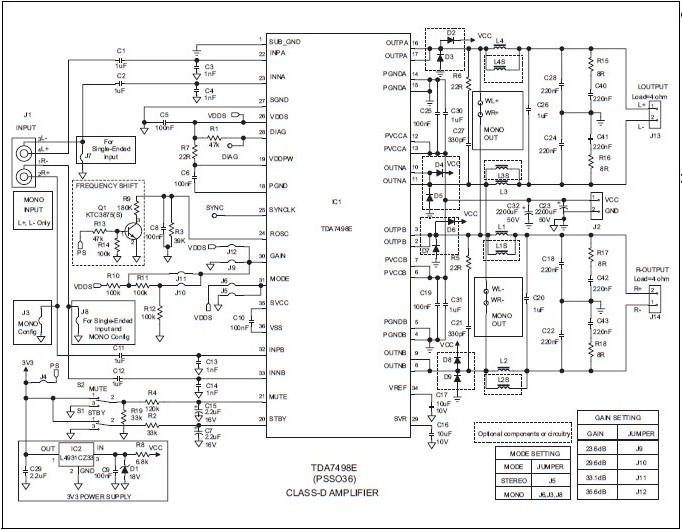 TDA7498E放大器能夠在立體聲和單聲道模式中實現音頻系統的靈活配置,并提供單聲道并行功能,在2.1聲道音響系統配置中驅動超低音揚聲器/低音揚聲器。新產品擁有100dB的信噪比,提供23.8dB、29.8dB、33.3dB、35.8dB四個可選的固定增益設置。采用