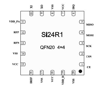 Si24R1是一款新型單片射頻收發器件,工作于2.4 GHz~2.5 GHz ISM頻段。內置頻率合成器、功率放大器、晶體振蕩器、調制器等功能模塊,并融合了增強型ShockBurst技術,其中輸出功率和通信頻道可通過程序進行配置。Si24R1功耗低,在以-6 dBm的功率發射時,工作電流也只有9 mA;接收時,工作電流只有12.3 mA,多種低功率工作模式(掉電模式和空閑模式)使節能設計更方便。Si24R1管腳兼容NRF24L01。
