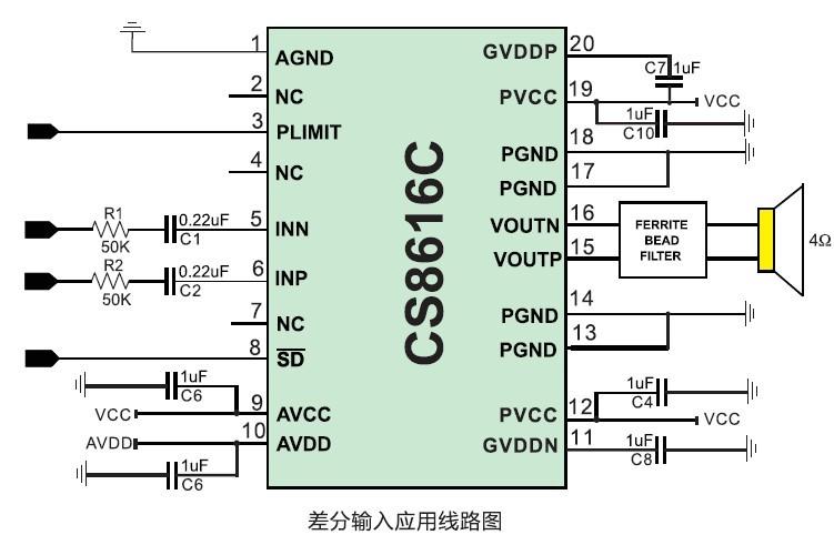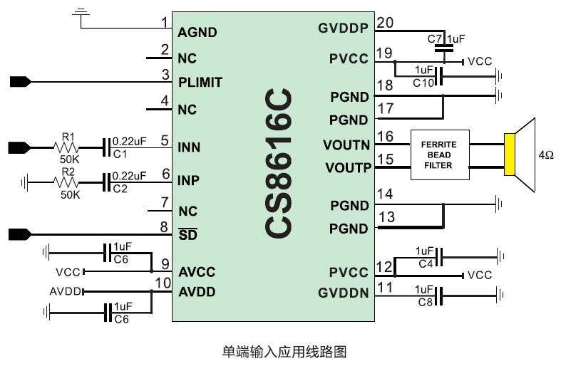 CS8616C是一款20W單聲道高效D類音頻功率放大電路。先進的EMI抑制技術使得在輸出端口采用廉價的鐵氧體磁珠濾波器就可以滿足EMC要求。內部包括一個功率可調限制器和直流檢測電路來對揚聲器進行保護。功率可調限制器允許用戶設定一個比電源電壓低的虛擬電壓來限制流過揚聲器的總電流,直流檢測電路在輸入電容損壞或者輸入短路時關斷輸出級。CS8616C內置了過流保護,短路保護和過熱保護,有效的保護芯片在異常的工作條件下不被損壞。CS8616C可以驅動低至3Ω負載的立體聲揚聲器,具有高達90%的效率,使得在播放音樂的時候不需要額外的散熱器。