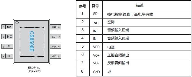CS8505E提供了纖小的ESOP8L封裝類型供客戶選擇,其額定的工作溫度范圍為-40℃至85℃。