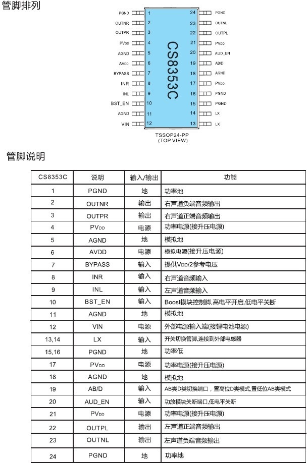 恒定4.8W/2.5V-5.5V(內置自適應Charge Pump模塊)/4Ω |