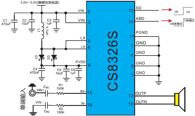 固定21倍增益,防破音,AB/D切換,電源自動增益調節,功率限制,多階電源自適應功能 內置BOOST升壓模塊,恒定10W輸出功率R類單聲道音頻功率放大器 |