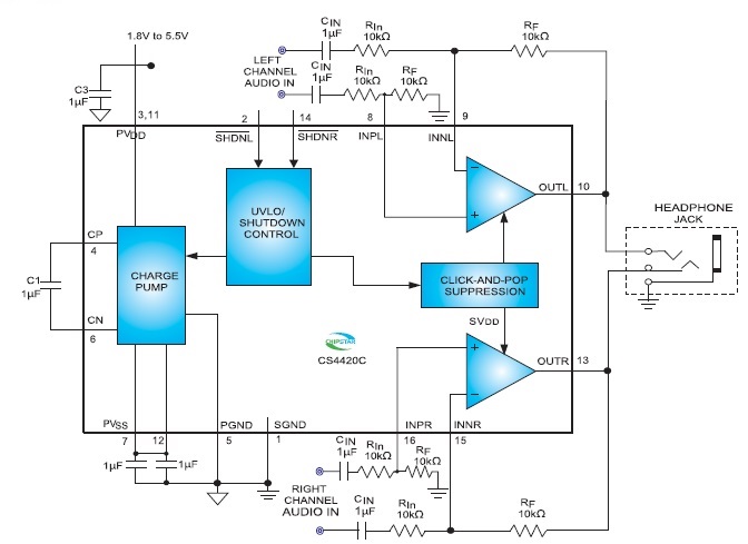 CS4420 工作在1.8V至5.5V單電源下,僅消耗5mA電源電流,具有短路保護與熱過載保護,額定溫度范圍是-40°C至+85°C。CS4420 采用16引腳TSSOP封裝,。