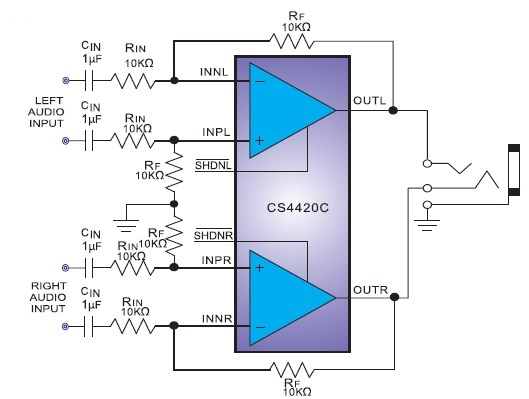 CS4420 每個通道可向16Ω負載輸出130mW,THD+N僅為0.006%。217Hz時具有86db的高電源抑制比(PSRR),允許該器件工作在嘈雜的數字電源,無需額外的線性穩壓器件。精巧的咔嗒聲抑制電路消除了啟動與關斷過程中的可聞噪聲。精巧的咔嗒/噼噗聲抑制電路消除了啟動與關斷時的咔嗒聲和噼噗聲。獨立的左/右低功率關斷控制可以在混合模式、單聲/立體聲應用中盡可能地節省能源。