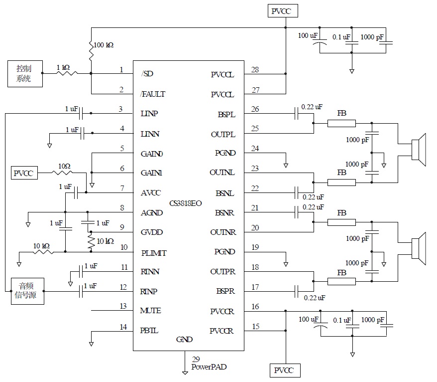 CS3818是一款15W(每聲道)立體聲高效D 類音頻功率放大電路。先進的EMI抑制技術使得在輸出端口采用廉價的鐵氧體磁珠濾波器就可以滿足EMC 要求。內部包括一個功率可調限制器和直流檢測電路來對揚聲器進行保護。功率可調限制器允許用戶設定一個比電源電壓低的虛擬電壓來限制流過揚聲器的總電流,直流檢測電路在輸入電容損壞或者輸入短路時關斷輸出級。管教兼容TPA3140D2/TPA3144D2