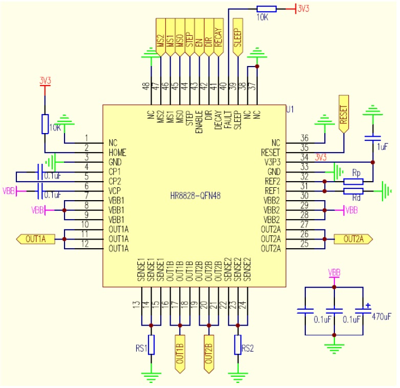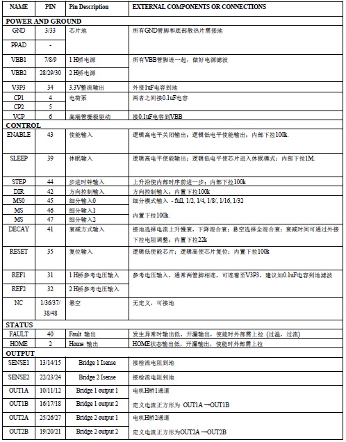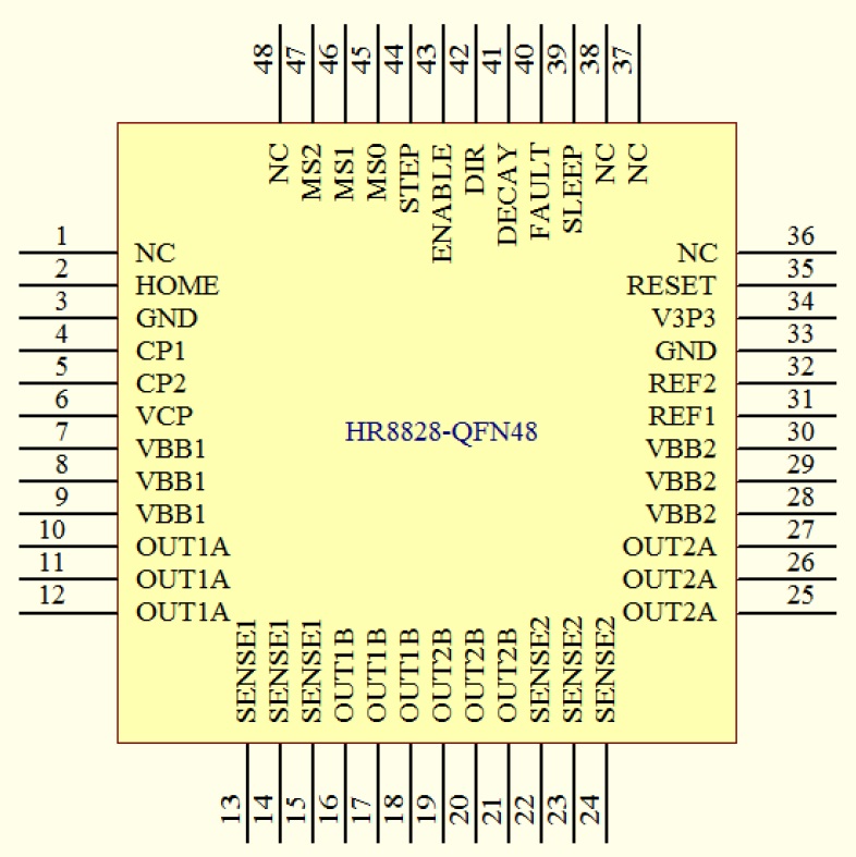 HR8828提供一種帶有裸露焊盤的QFN48 7mm*7mm封裝,還有一種帶裸焊盤的LQFP48封裝,能有效改善散熱性能,有利PCB布局,且是無鉛產品,引腳框采用100%無錫電鍍。管腳功能兼容TB6560