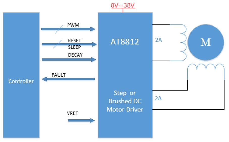 AT8812為打印機和其它電機一體化應用提供一種雙通道集成電機驅動方案。AT8812有兩路H橋驅動,最大輸出38V 2A,可驅動兩路刷式直流電機,或者一路雙極步進電機,或者螺線管或者其它感性負載。雙極步進電機可以以整步、2細分、4細分運行,或者用軟件實現高細分。