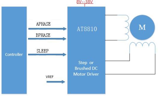 AT8810為打印機和其它電機一體化應用提供一種雙通道集成電機驅動方案。AT8810有兩路H橋驅動,最大輸出38V 1A,可驅動兩路刷式直流電機,或者一路雙極步進電機,或者螺線管或者其它感性負載。雙極步進電機可以以整步運行,或者PHS端做PWM用軟件實現高細分。
