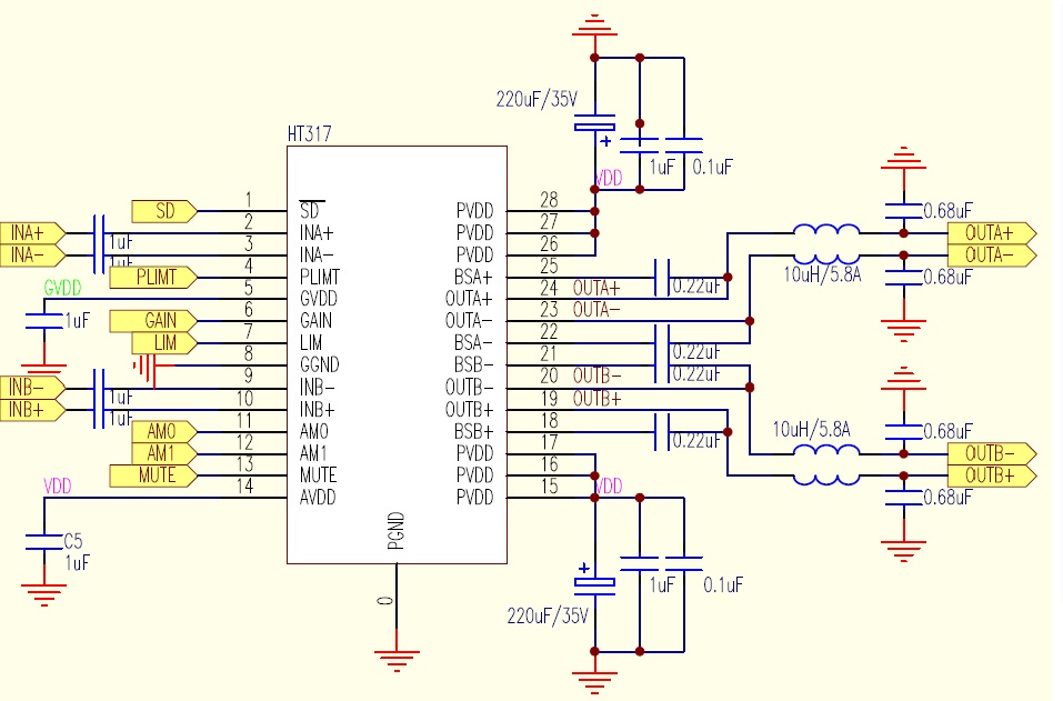 當前位置:首頁->產品展示->功放IC->HT317(42W立體聲/75W單聲道D類功放IC) |