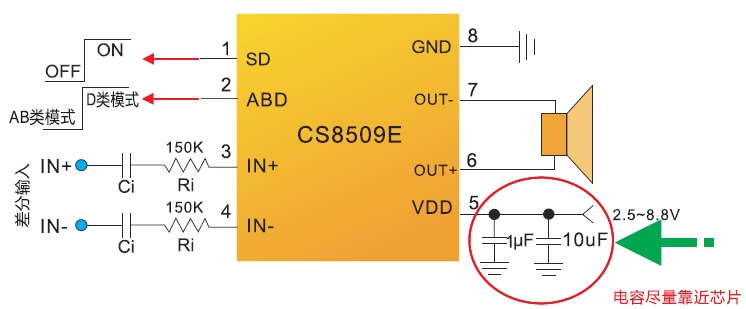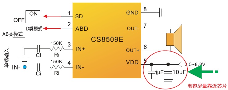 CS8509E內置了過流保護,短路保護和過熱保護,有效的保護芯片在異常的工作條件下不被損壞。