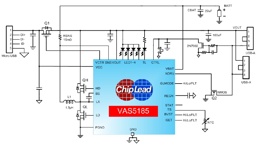 VAS5185是一款鋰電池充電管理與升壓DC/DC的單芯片專用IC,其應用時僅需極少的外圍器件,有效降低BOM成本,適用于單節鋰離子/鋰聚合物電池的移動電源充放電管理。 |