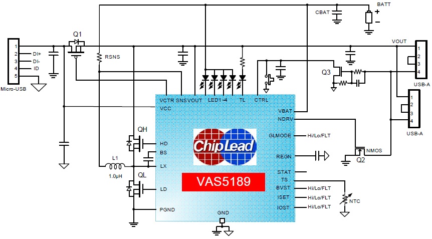 VAS5185是一款鋰電池充電管理與升壓DC/DC的單芯片專用IC,其應用時僅需極少的外圍器件,有效降低BOM成本,適用于單節鋰離子/鋰聚合物電池的移動電源充放電管理。 |