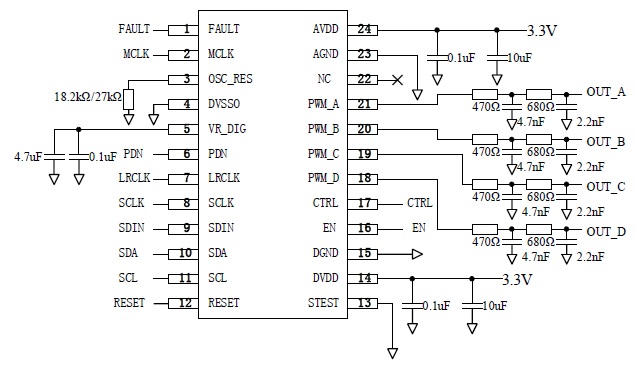 I2S數(shù)字輸入33W立體聲D類音頻功放芯片、內(nèi)置DSP小音量低頻增強(qiáng)等算法 |