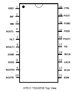HT511 2.8W/5V/4Ω或1.4W/3.6V/4Ω TSSOP-20/QFN-20 2.5V-6.5V 2.8W I2S 輸入單聲道D類音頻功率放大器