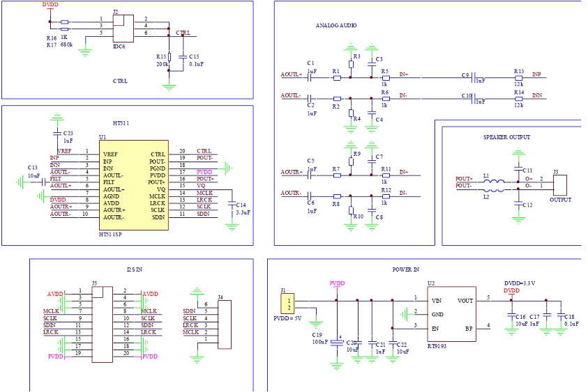 HT511內(nèi)部集成了DA轉(zhuǎn)換器,其I2S輸入最大支持 24-bit字節(jié) ,并且可自動監(jiān)測采樣頻率,最高支持 192kHz。
