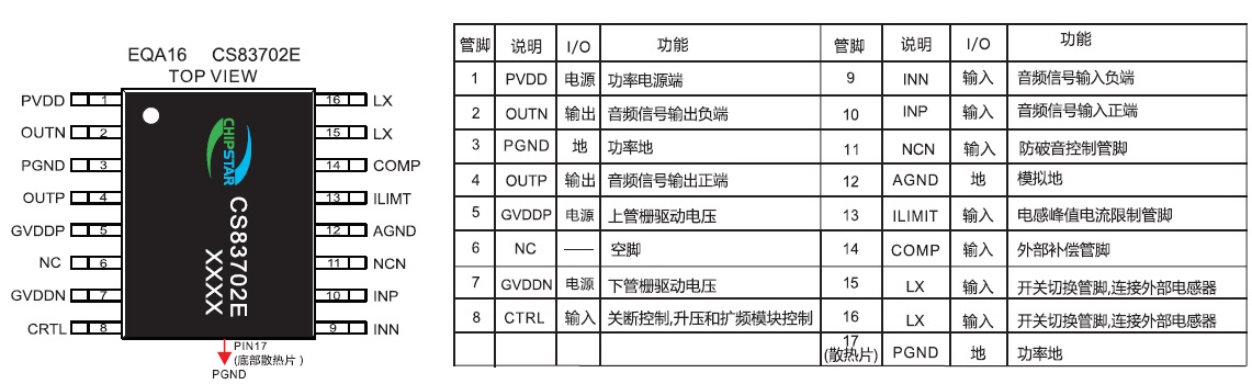 CS83702E提供了纖小的的EQA16封裝形式供客戶選擇 ,封裝尺寸和 ESOP8一致 ,其額定的工作溫度范圍為 -40℃至85℃。