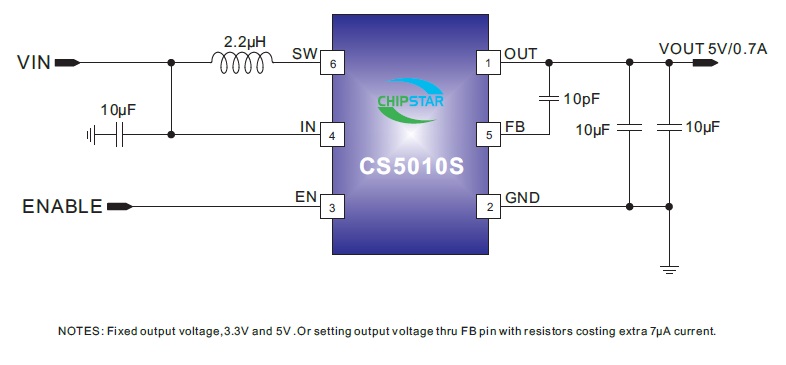 CS5010S是一 款高效同步升壓轉換器,具有低至2µA的超低靜態電流。它能夠從低壓電源輸出至少3W的功率,即5V輸出時為0.7A。
