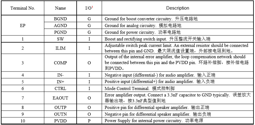內置高效率自適應電荷泵升壓,防削頂失真功能,D/AB切換的5.5W單聲道高保真音頻功率放大器 |