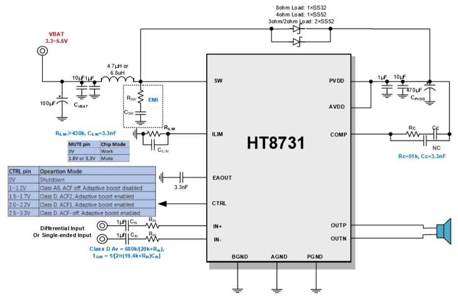 HT8731特有的自適應動態升壓,能根據芯片需要輸出功率的大小來對應調整電源模塊的輸出電壓,最大限度提高鋰電池的續航時間;其輸入電流限制功能可設定最大輸入電流,以免因鋰電池瞬間電壓跌落太低造成主控重啟;能通過一個主控IO口實現關斷、開啟、D類/AB類、防破音開啟/關閉等各種模式的切換,節省藍牙主控的資源,外圍簡單;2檔防破音模式,ACF2高保真低失真模式適合小箱體的藍牙音箱,ACF1寬動態音量震撼模式適合戶外藍牙音箱,兩種模式選擇只需要改動外圍電阻,便可呈現不同風格的音質。