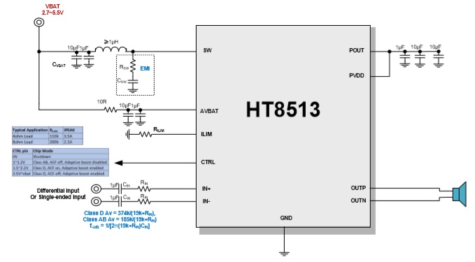 HT8513具有AB類和D類的自由切換功能,在受到D類功放EMI干擾困擾時,可隨時切換至AB類音頻功放模式。