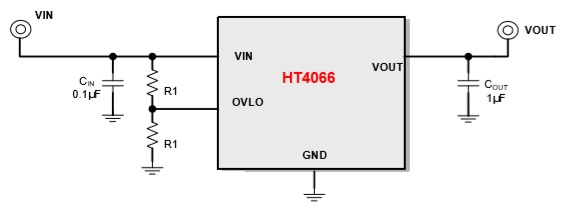 HT4066是一顆過壓保護IC,其內置125mΩ (TYP)大電流MOS,其可對低電壓工作的系統 進行電壓保護,最高+26VDC。 當VIN電壓超過OVP值時,HT4066將關閉 MOS以關斷VIN到VOUT的路徑,從而保護負 載。 當OVLO接地時,HT4066自動設置為固定的 5.85V過壓保護值。OVLO外接分壓電阻時,可 設置4~10V的過壓保護值。 當HT4063超過最大結溫時,器件關閉。 該產品提供SOT23-6封裝,支持-40℃到+85℃ 的環境溫度。