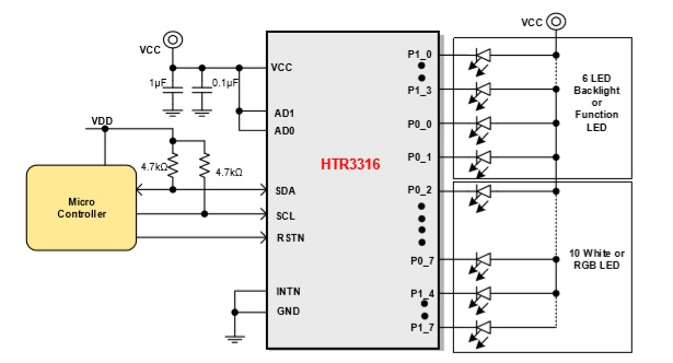 HTR3316是一款16路多功能LED驅(qū)動器和 GPIO控制器。16個I/O端口中的任何一個都可以配置為LED驅(qū)動器模式或GPIO模式。此外任何GPIO都可以單獨配置為輸入或輸出。 |