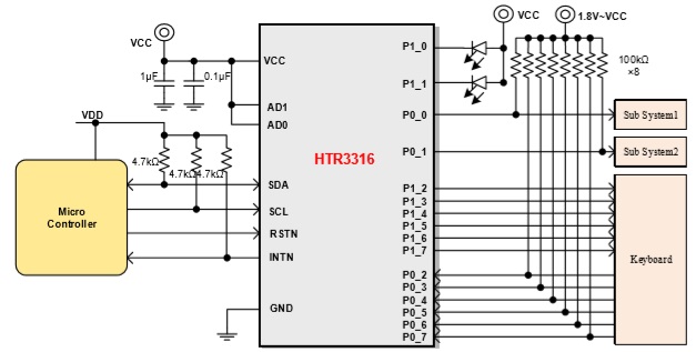 HTR33xx 是一款I(lǐng)2C 和 SMBus IO 擴 展 器 , 2.2V~5.5V電源供電。16個IO端口中的任何一個都可以單獨配置為輸入或輸出。此外,任一IO可驅(qū)動LED。 |