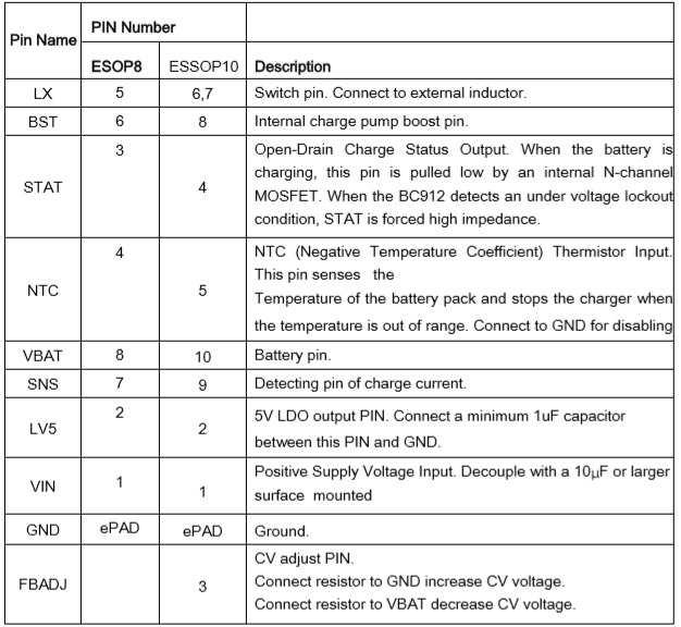 產品名稱: BC912(8.4V/8.7V/8.8V充滿轉燈電壓可調、3A雙節鋰電充電管理IC)