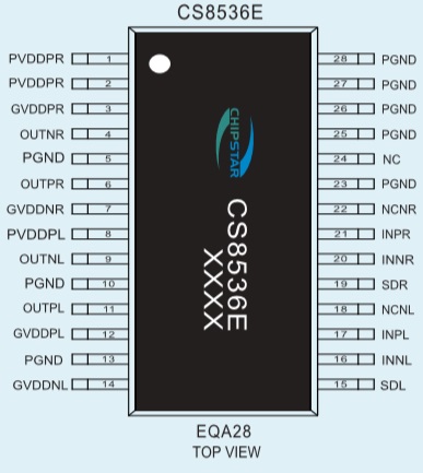 CS8536E提供了纖小的的EQA28封裝形式供客戶選擇,封裝尺寸和ESOP16-致,其額定的工作溫度范圍為-40℃至85℃。