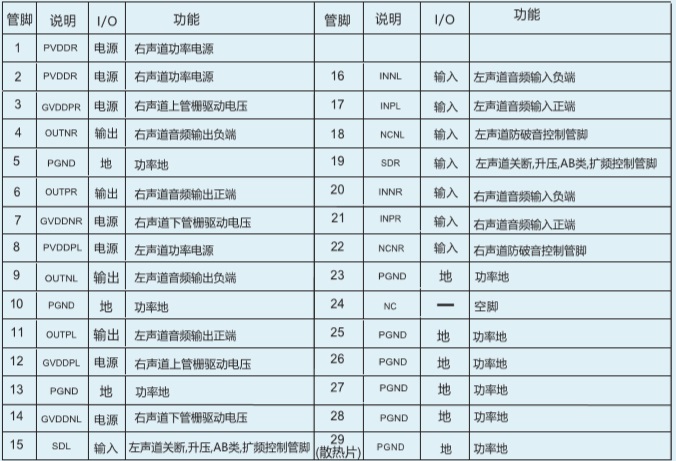 擴頻模式,靜音功能,三種防破音模式,AB/D切換,30W單聲道音頻功放 |