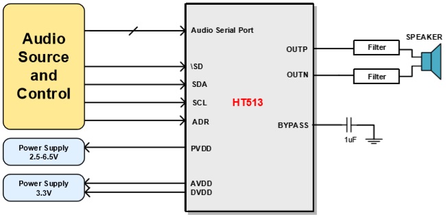產品名稱: HT513(I2S輸入2.8W單聲道D類音頻功放IC)