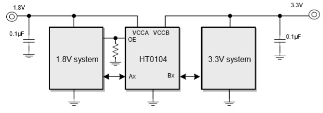 產品功能: HT0104是一款4路雙向電平轉換器,其使用兩個獨立的供電VCCA和VCCB。